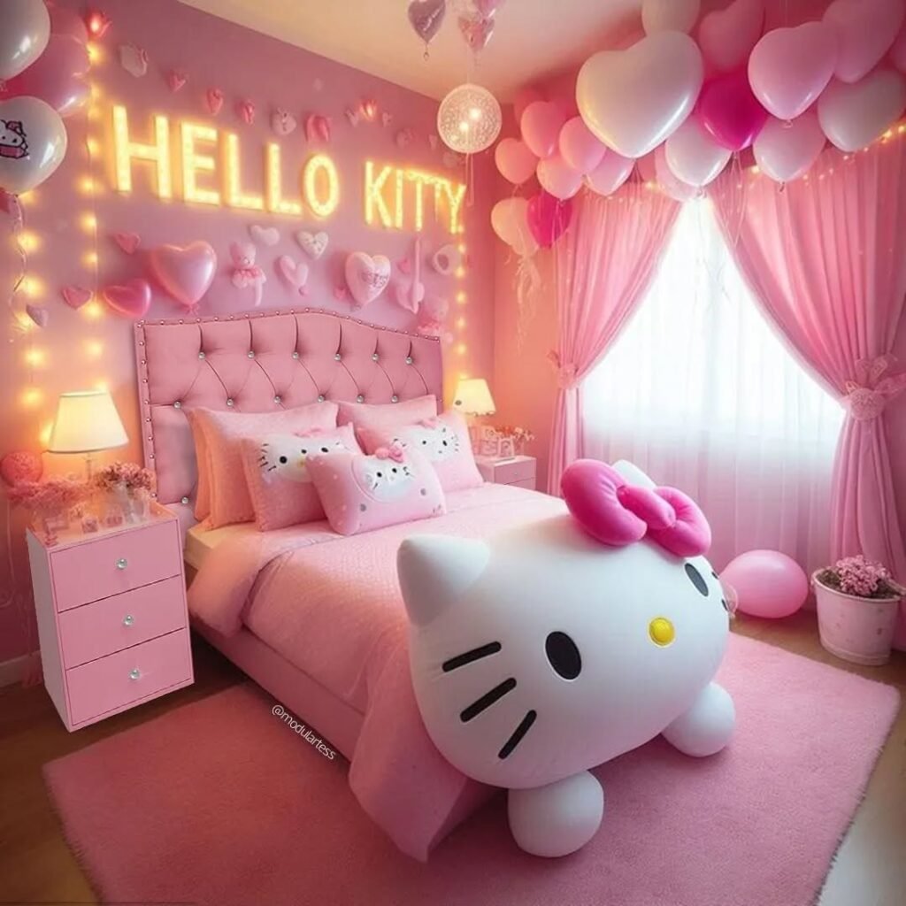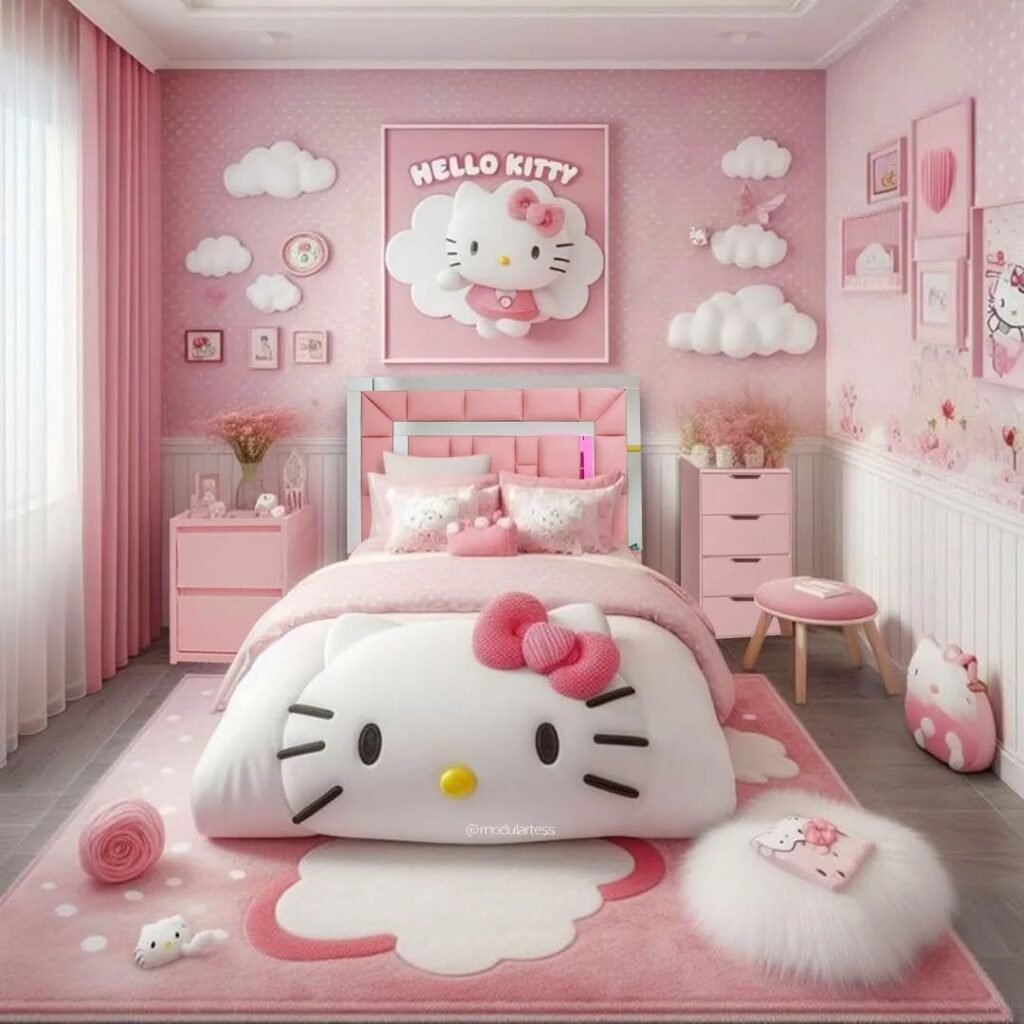 The design of Hello Kitty blends modern aesthetic with nostalgia. Adults and teens all are attracted to the character’s playful charm, pastel colors, and soft design. An attractive Hello Kitty room is also cozy, joyful, and personal which makes it a popular option for bedrooms, dorm rooms, and creative areas.