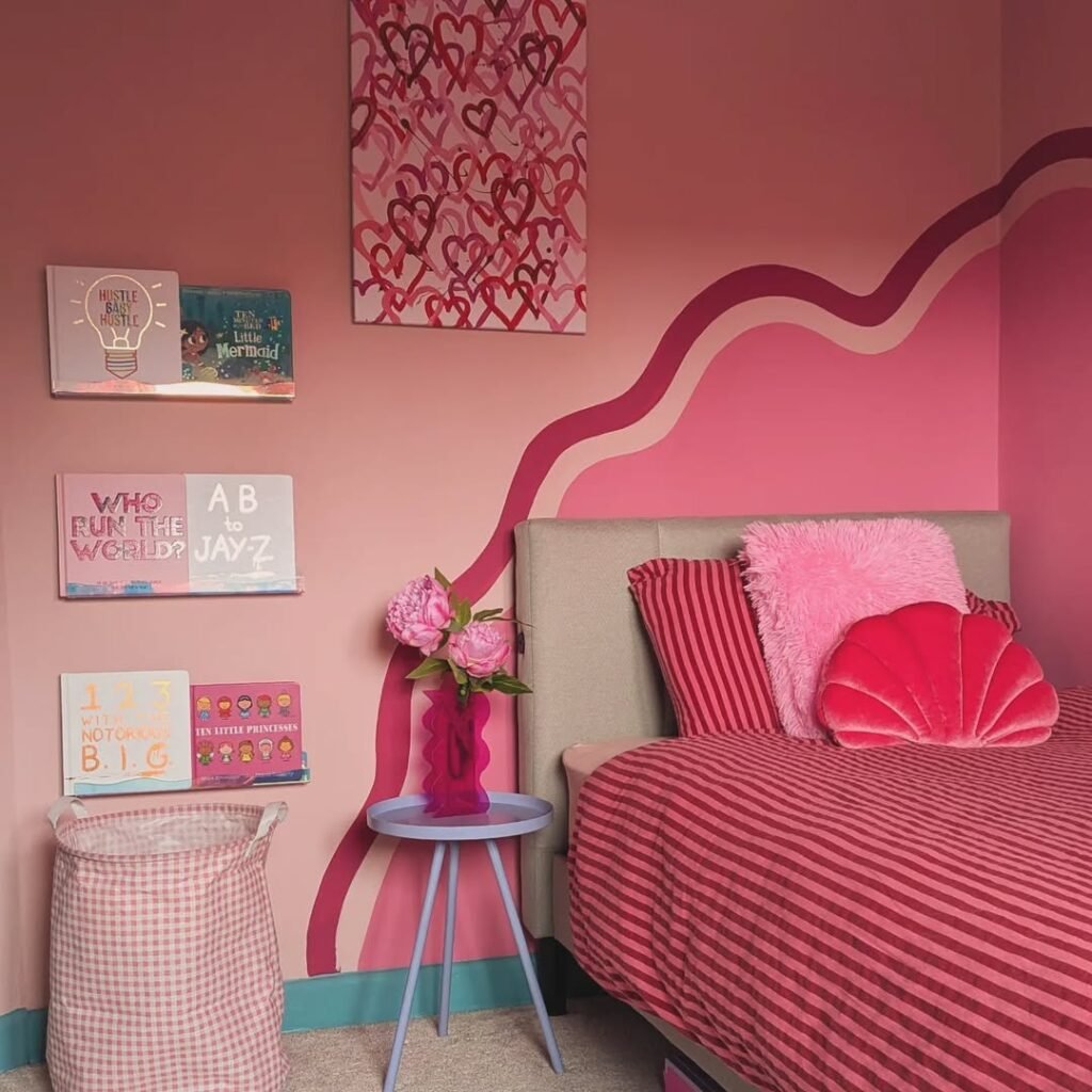 - Pink accent walls or pastel wallpaper