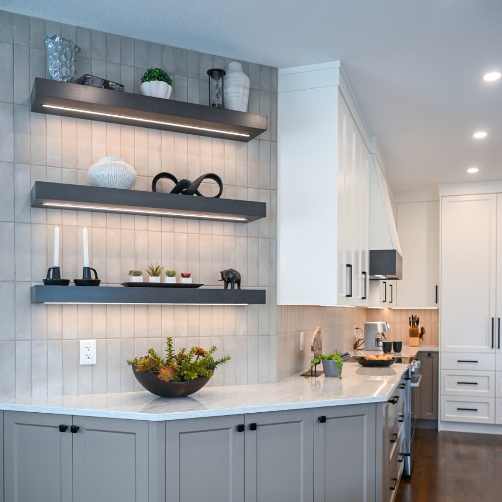 Floating kitchen shelves offer a balance of practicality and design. Unlike bulky cabinets, they keep the kitchen open and visually lighter.