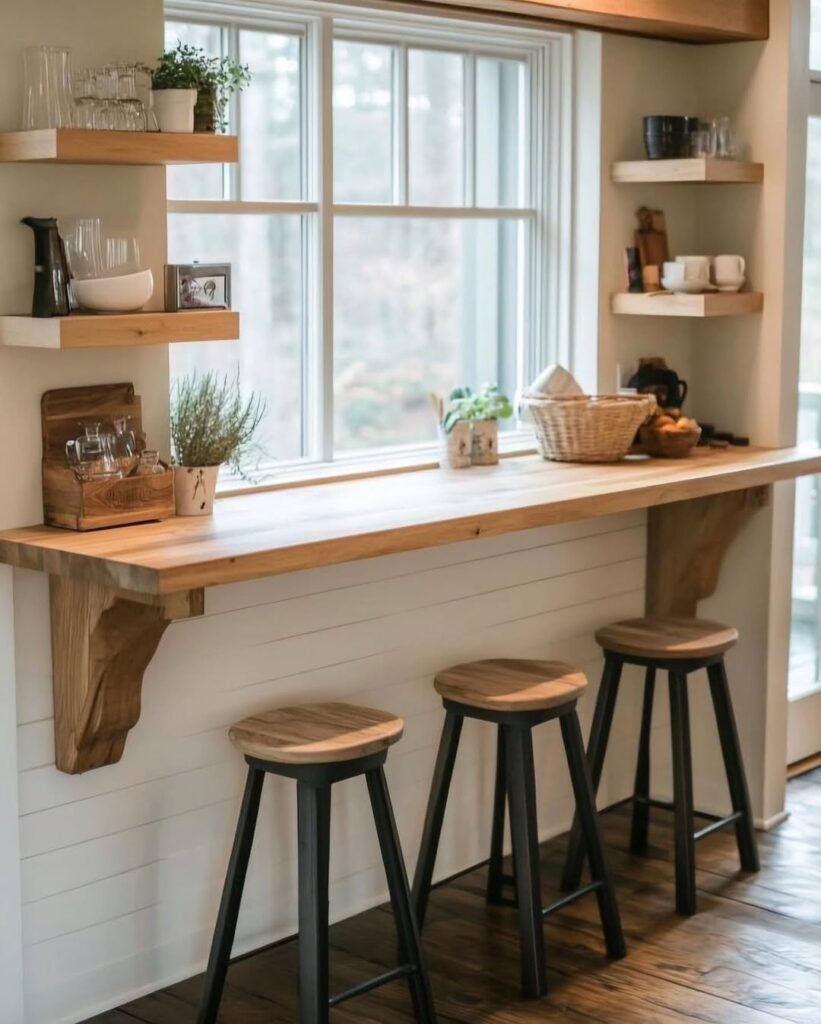 These shelves are great for storing spices, mugs, or small plants. Using the same wood finish as the rest of the kitchen keeps the design cohesive while improving functionality.