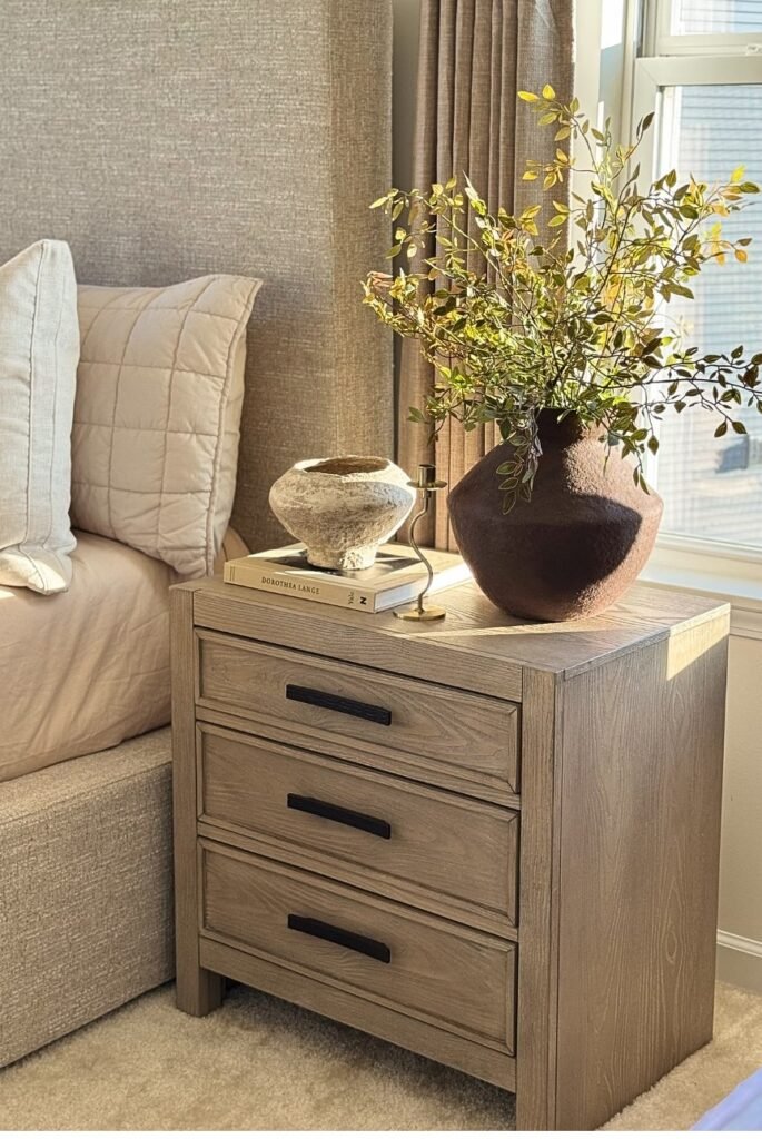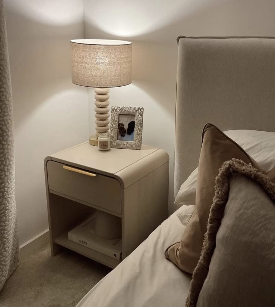 Minimalist nightstand decor relies on intentional choices. One lamp, one book, and one subtle accent are usually enough. This approach supports bedroom nightstand styling that feels calm and uncluttered.