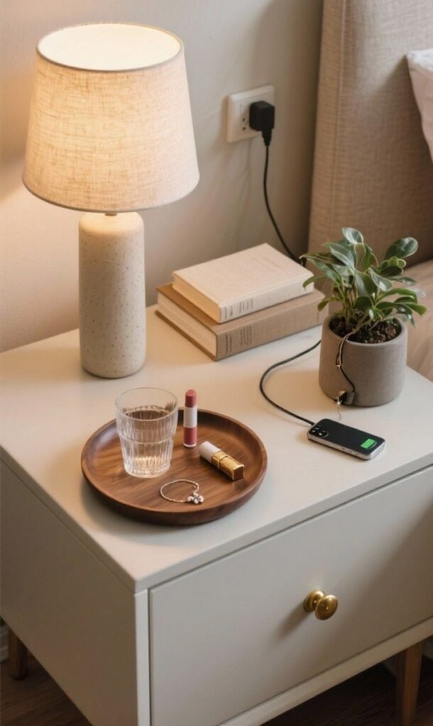 Small nightstand decor requires thoughtful planning. Vertical elements like lamps and compact decorative items for nightstand use help save space. Keeping the surface simple ensures the nightstand remains functional without feeling crowded.