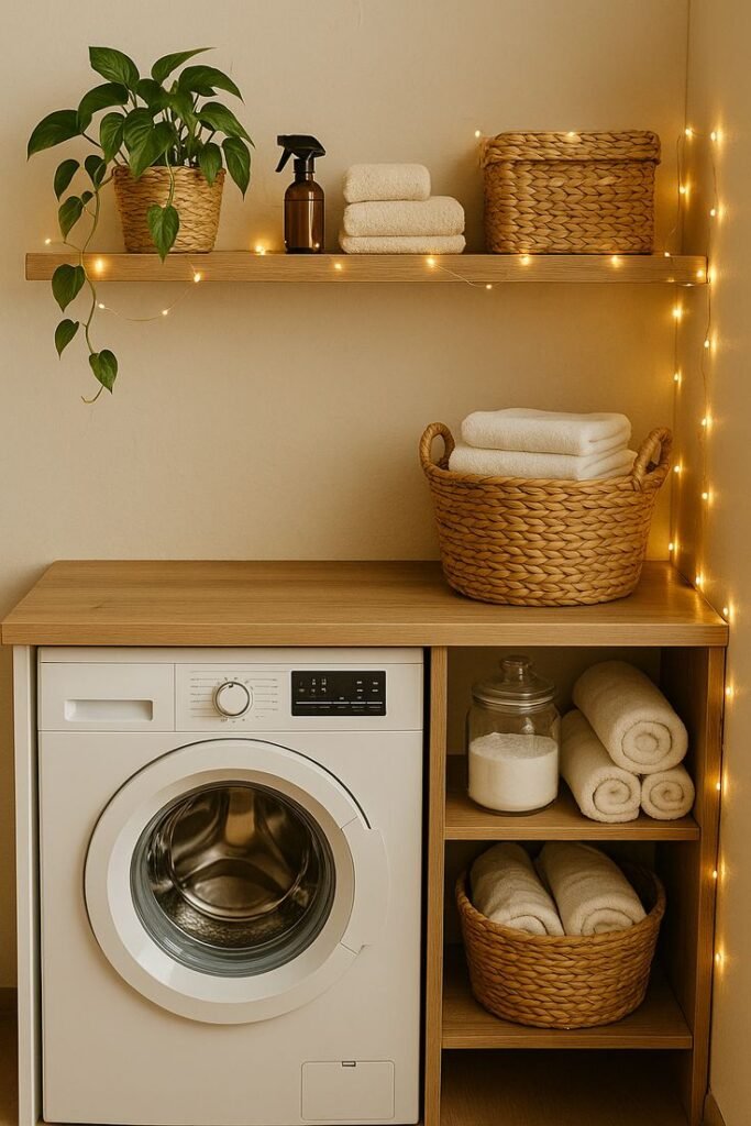 Adding framed prints, motivational quotes, or minimalist artwork brings personality to the laundry area. Even something as simple as stylish storage jars for detergent can elevate the overall look.
