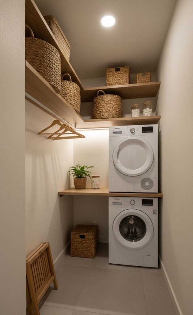 Baskets and labeled bins improve small laundry room organization and help maintain a tidy appearance. Adding a fold-down drying rack or retractable clothesline is also a smart way to save space without sacrificing functionality.