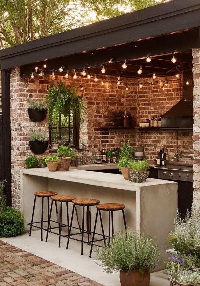 Adding vertical greenery enhances both style and function in a small outdoor kitchen. Wall-mounted planters or herb gardens provide fresh ingredients while saving valuable counter space. Vertical plants also soften hard surfaces and help the kitchen blend naturally with the outdoor environment.
