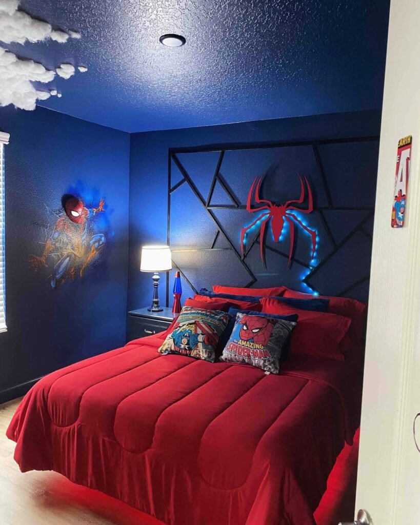 The spiderman bedroom decor theme can be elevated while remaining trendy and attractive with a web-pattern accent wall or a city skyline mural.